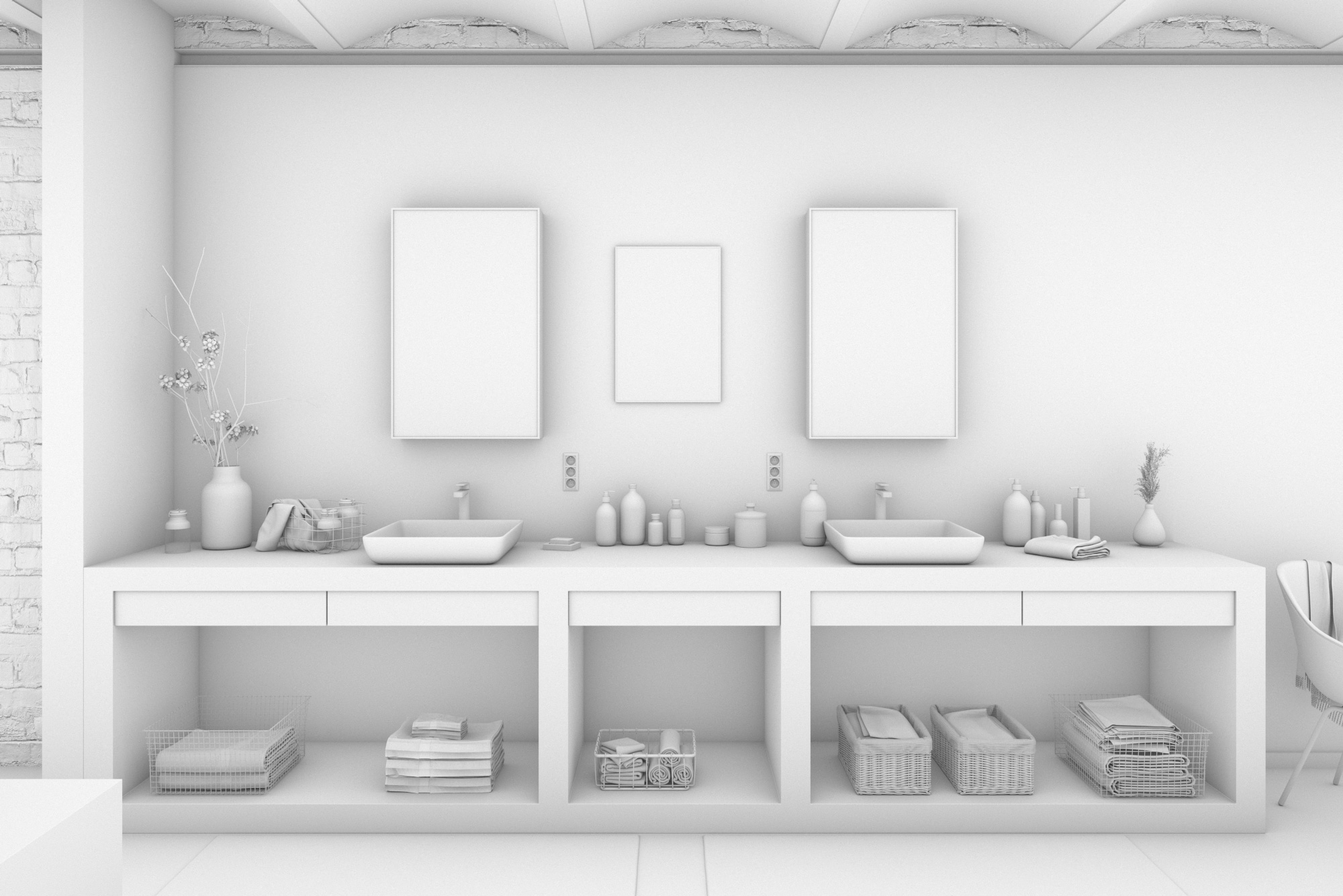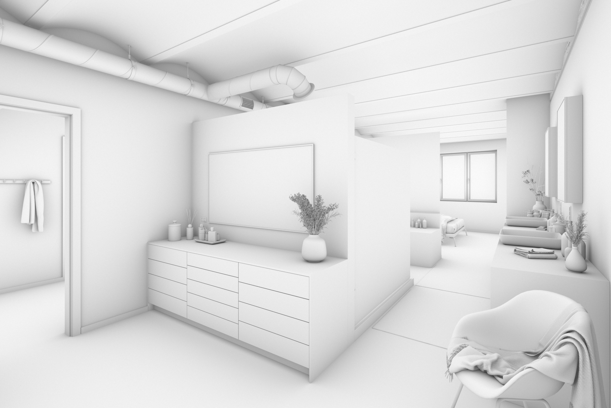 For this commercial project I was asked to recreate two floors in an industrial building in Brussels. Both floors will become individual lofts. The entire structure of the ceilings and pillars are custom made as well as the kitchen cabinets and some furniture elements. An interior designer provided me with inspirations for filling each space with furniture, plants and decoration.